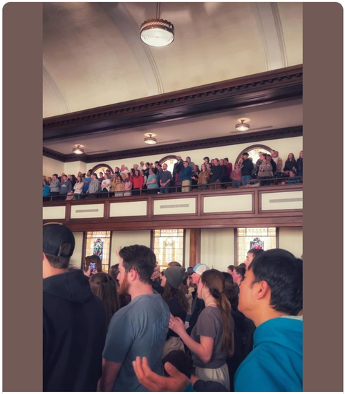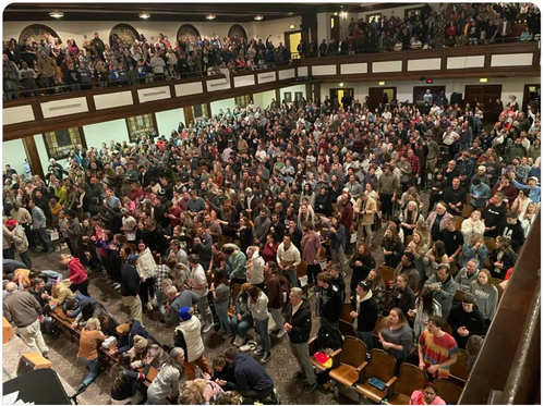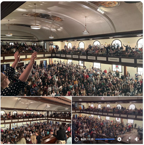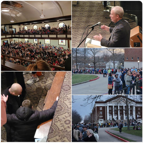 83 hours later and still going strong! EVERY parking space within a few hundred yards of Hughes is packed, and what you can’t see in the video is the standing room only in the back and into the foyer and stairwells. May the fire marshal have a special anointing of patience.