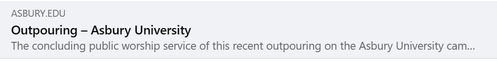 I'm still processing. I'll keep processing. I'm praying that God will continue to pour himself out upon the gathering there at Asbury. I'm praying that God would do the same elsewhere (reports of other nonstop gatherings on College campuses and churches are exciting!). I'm also praying that God will do the same in my church. And I'm certainly praying that God would pour himself out upon me and through me, CONTINUALLY!
