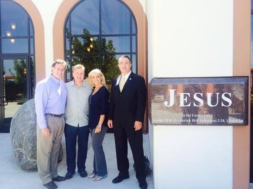 Sen. Rick Santorum and Rep. Trent Franks when they spoke at Skyline Church in 2014, posing by the "JESUS" cornerstone.