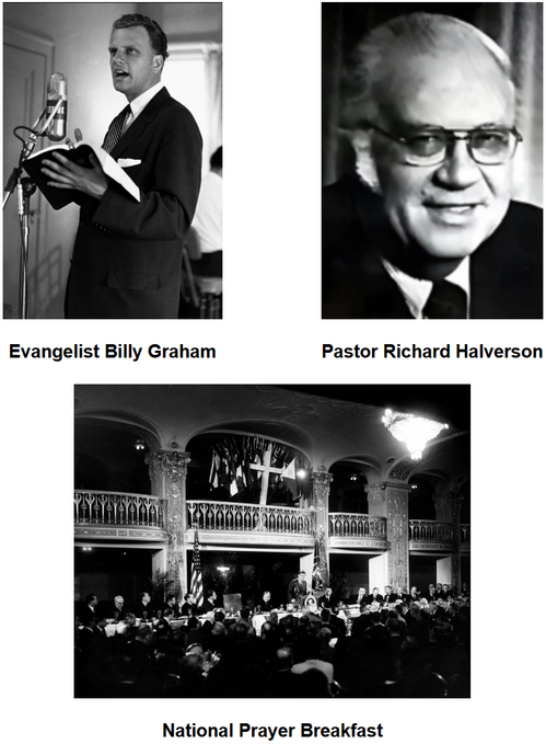 Billy Graham convinced a hesitant Eisenhower, who was quite private about his now Presbyterian—originally “River Brethren” Mennonite—faith, to do so. Joined by Pastor Richard Halverson (NOTE: I was a classmate of his son – Chris Halverson – when I was a student at Princeton Theological Seminary) the Presidential Prayer Breakfast was born in 1953, which had previously been known as the Senate Prayer Breakfast. The name was changed in 1970 to the “National Prayer Breakfast.” The National Prayer Breakfast has enjoyed enormous visibility, impact, and success, both nationally and internationally.