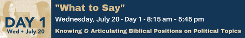 Surveys by George Barna show that people are silent because they do not know what to say. “What to Say” teaches how to respond to many political topics. As speakers share, our stenographer-scribe will type the bullet points on each issue, which will be seen on the screens in the front of the room, and then will be electronically transferred to your computer later, creating a “digital flashcard” for you on each topic. The goal? To help you really know what to say.