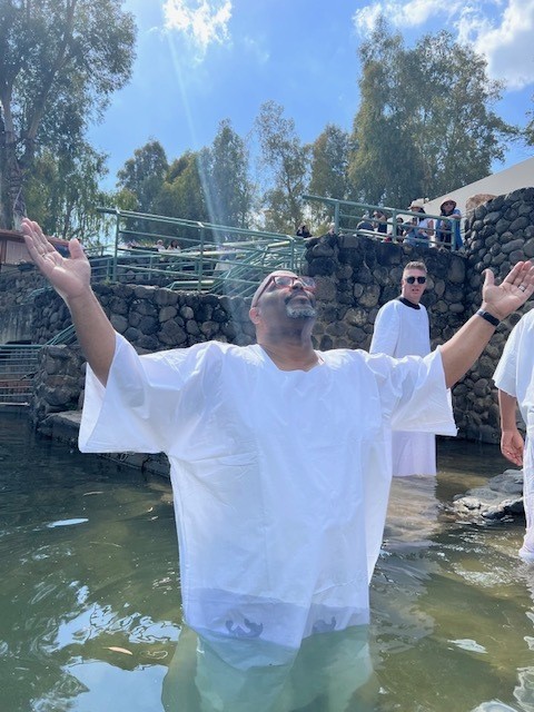 This is LaMar Harris, Sr at his baptism in the Jordan River in March 2023. The sky opened and the clouds formed in the shape of a dove above him.