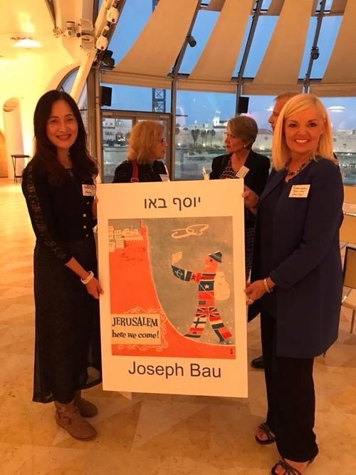 Hadassa and Clila Bau, daughters of Joseph and Rebecca Bau (of “Schindler’s List” movie fame, the couple who were “married” in the concentration camp) holding up the art work of their father announcing the Isaiah 2 and Micah 4 passages that someday the nations would stream up to Zion.