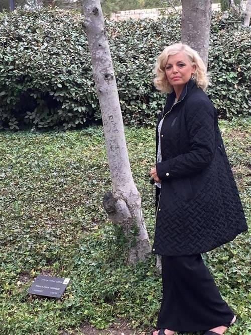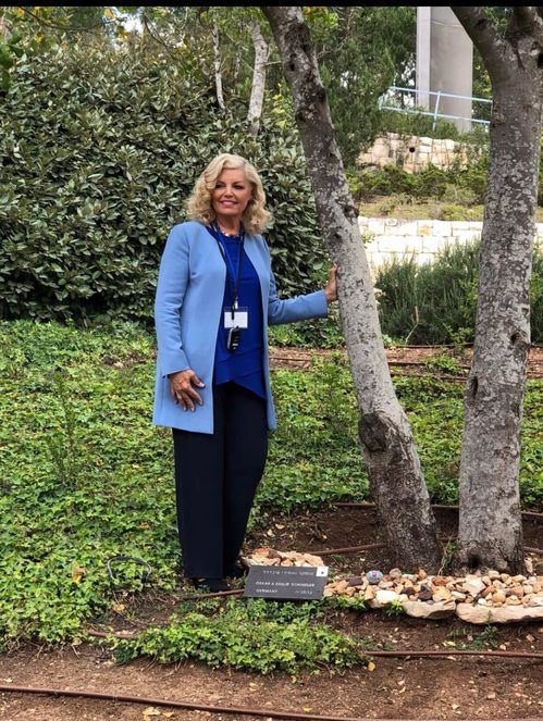 Rosemary Schindler Garlow standing by the tree planted by Oskar Schindler (Schindler’s List) on the “Boulevard of the Righteous Among the Nations” at Yad Vashem Holocaust Memorial Museum, Mt. Hertzel, Jerusalem.
