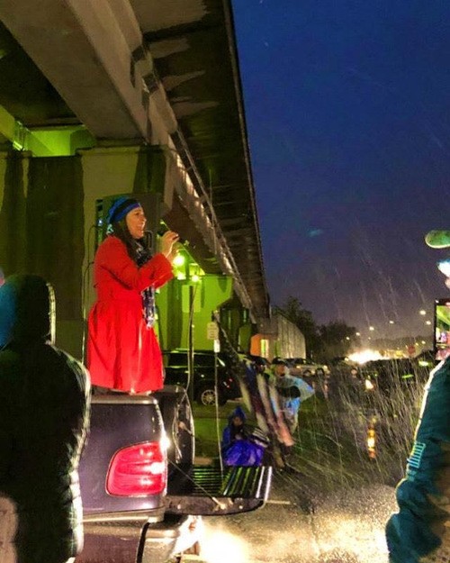 Alma leading in worship from the back of a pickup truck - in the snow - during COVID times