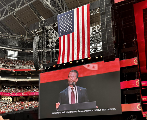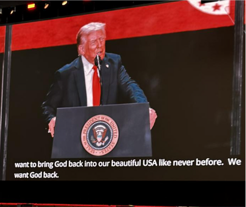 By then the cameras picked up that President Trump had entered the arena, and the massive IMAG screens showed him. The crowd roared their affirmation of his presence.