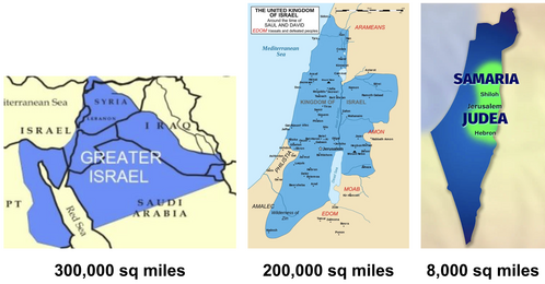The Bible promised the Jews approximately 300,000 square miles, from the Euphrates River to the Nile River. Under King David, 3,000 years ago, they had approximately 200,000 square miles. How much do they have now? A dinky 8,000 square miles.